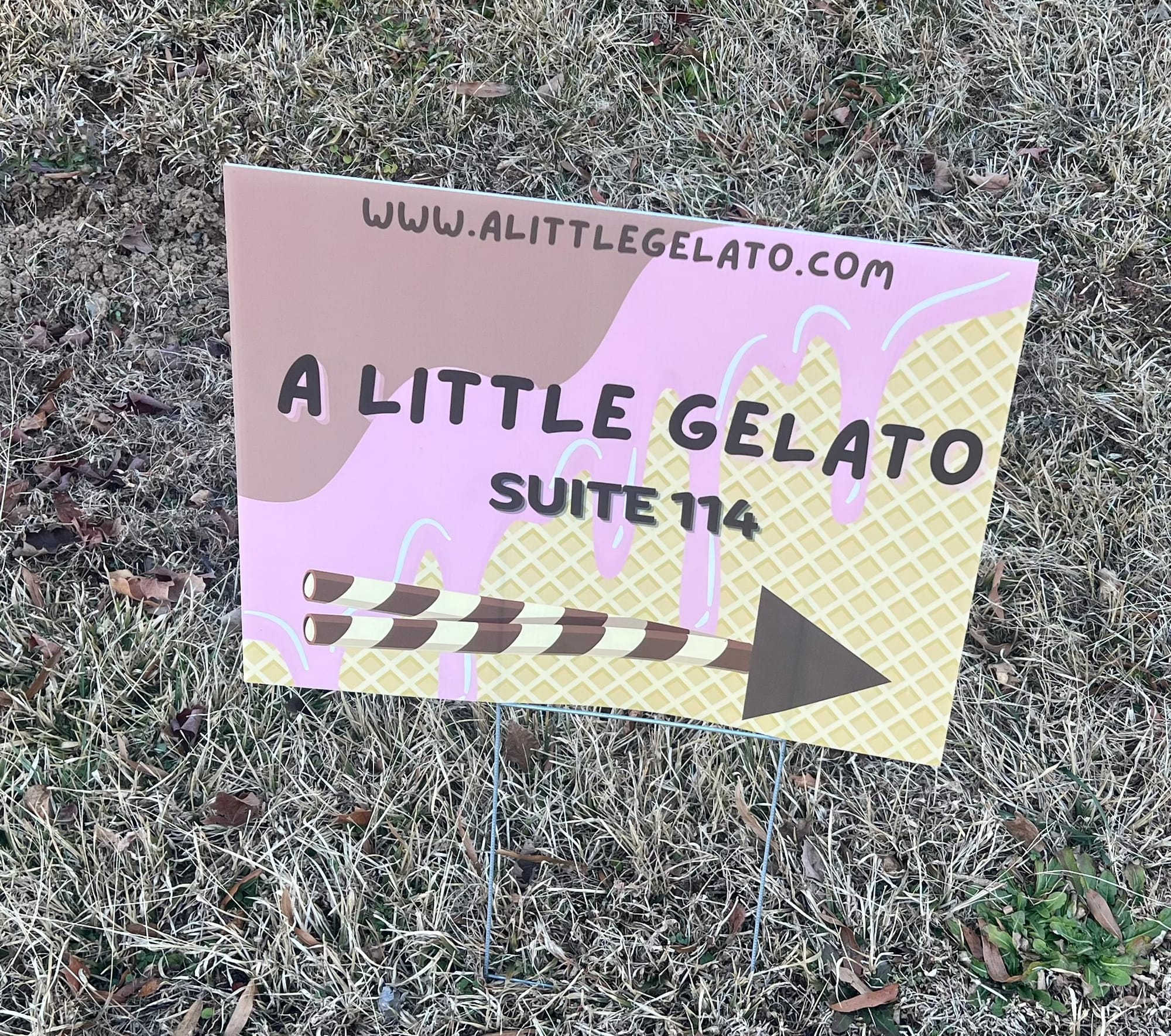 So you'll find A Little Gelato behind 4823 Meadow Dr. in Suite 114, next door to La Recette Patisserie. Just watch for the yard signs and the vertical banner.