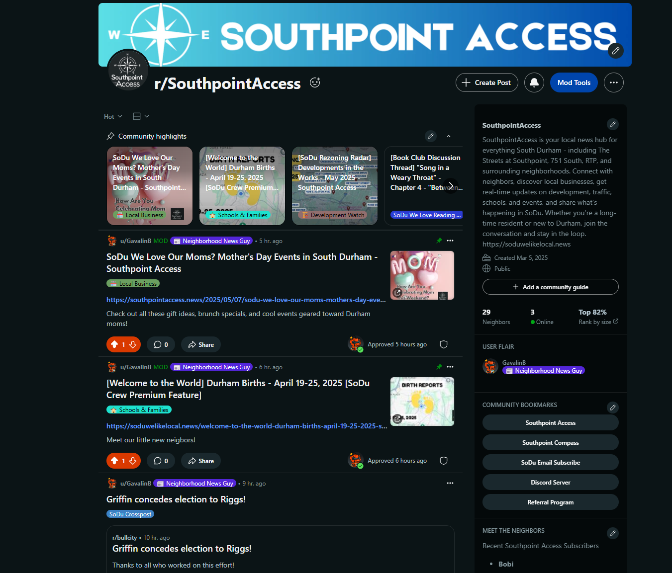 South Durham deserves a space online where neighbors can connect, share updates, ask questions, and build community - and that’s exactly what I'm creating with the brand-new Southpoint Access subreddit.