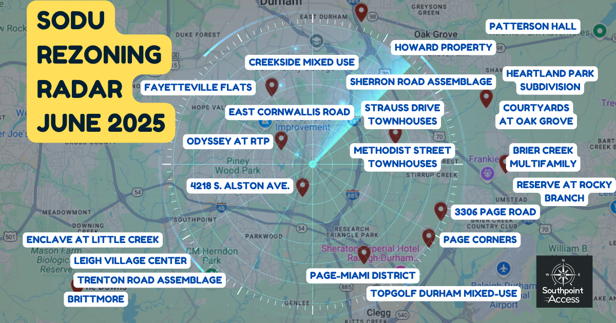 Welcome to the June edition of SoDu Rezoning Radar, your snapshot of what’s coming down the pipeline in South Durham’s fast-changing development landscape. From affordable housing and townhome clusters to major mixed-use districts and warehouse projects, rezoning requests can reshape neighborhoods – and it’s not always easy to keep track. I’ve rounded up the latest applications, upcoming meetings, and key decisions ahead so you can stay informed, speak up, and see what’s taking shape near you.