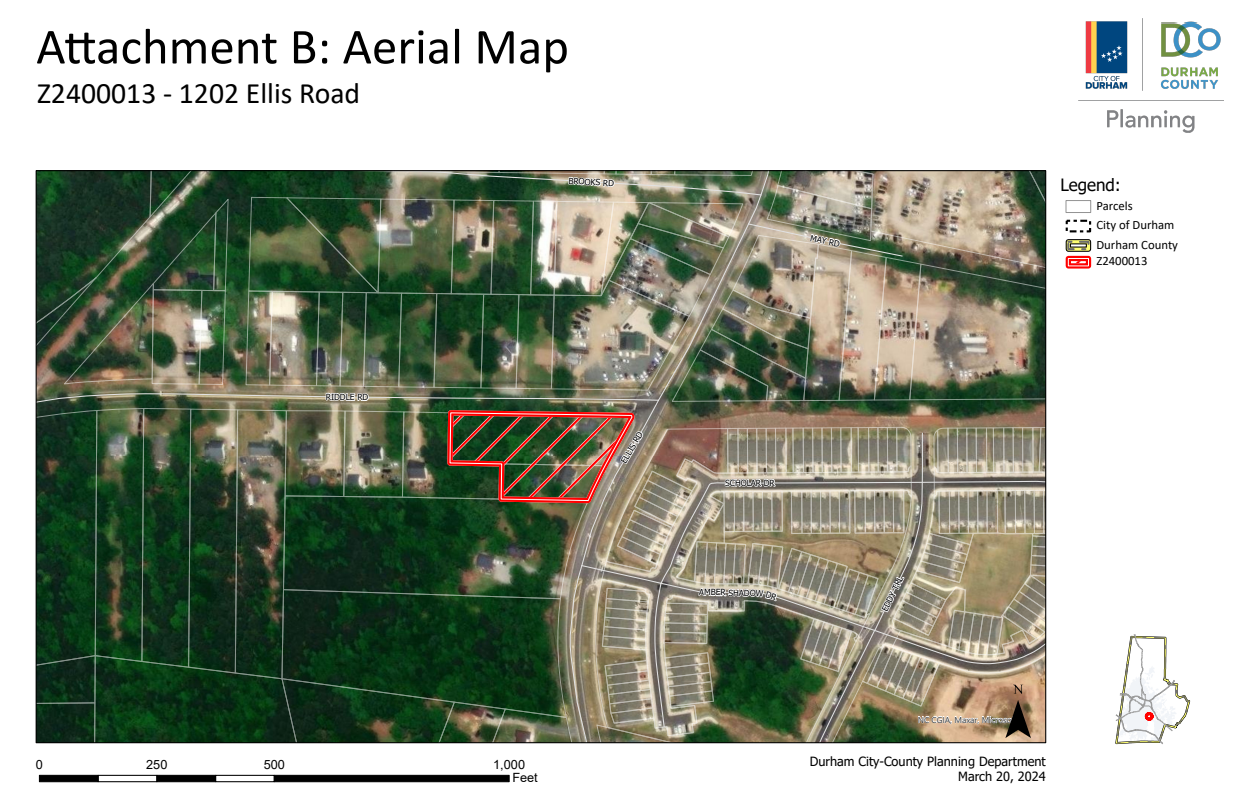 Applicant Thomas and Hutton, represented by Martin Coulter, wants to change the zoning of two parcels of land at 1202 and 1206 Ellis Rd., totaling 1.24 acres. Currently, they’re zoned for residential rural. The applicant wants the designation changed to residential suburban multifamily with a textual development plan to allow as many as 20 single-family or duplex units. The developer held two neighborhood meetings in January and December 2024, with nine and two attendees, respectively. No comments appear in the rezoning explorer about this project.