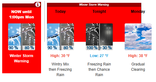 The National Weather Service forecast indicates we're still at risk for freezing rain into Monday. At this writing, as I walked Calliope for her morning constitutional, we've got a little sleet. After noon, that's expected to turn into freezing rain. We're warned that we could see accumulations of ice up to o.4 inches. That could still lead to power outages. It's certainly going to add to the treacherous road conditions, and public safety officials continue to discourage residents against driving.